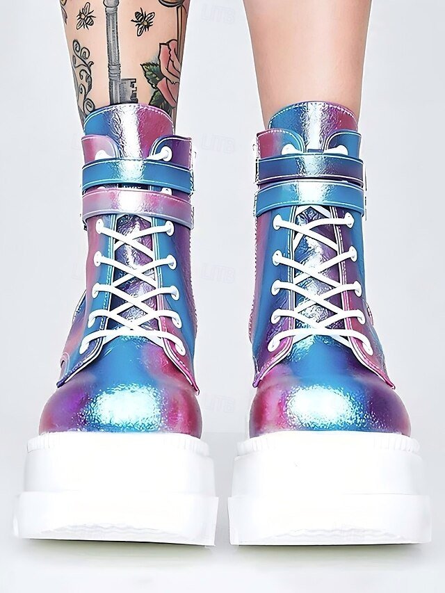 Step into the spotlight with our dazzling holographic platform wedge ankle boots. Designed for those who dare to be bold, these boots are perfect for making unforgettable statements at festivals and parties. With every step, you’ll capture the essence of modern fashion and the spirit of celebration.