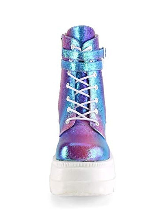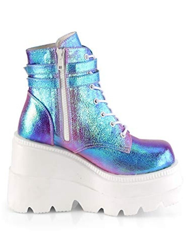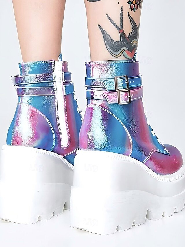 Dazzle at festivals with holographic platform wedge ankle boots. Perfect for bold fashion statements. Step into the spotlight.