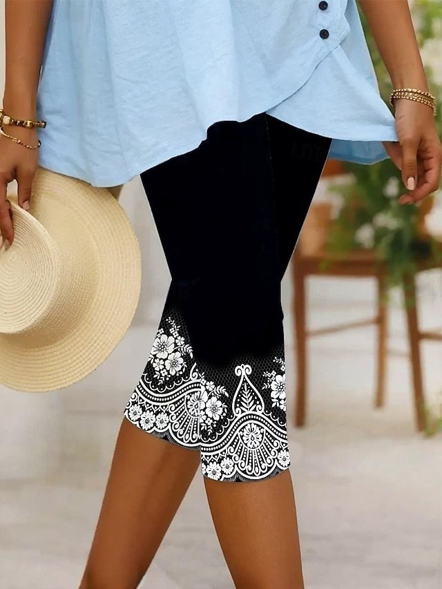 Elevate your style with our vintage floral capri leggings. Mid waist, breathable, perfect for vacations and daily wear in elegant blue tones.