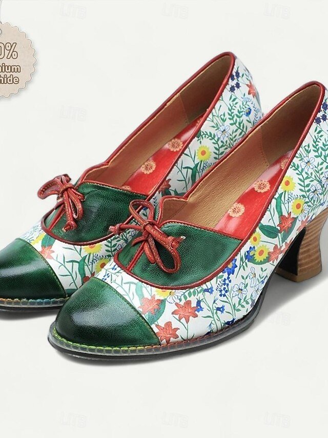 Elegant vintage floral lace-up heels in premium cowhide leather. Perfect for Oktoberfest and casual wear. Step into timeless grace.
