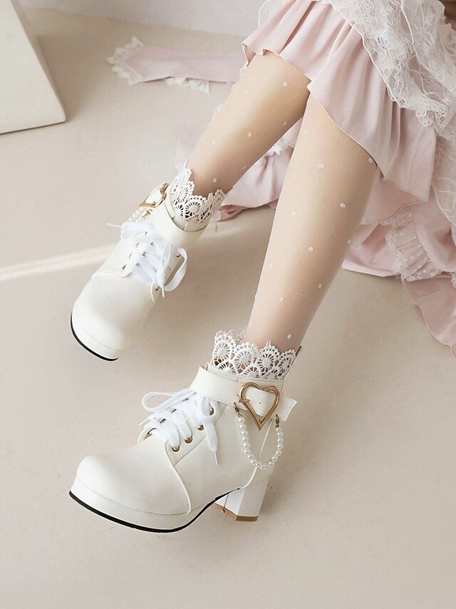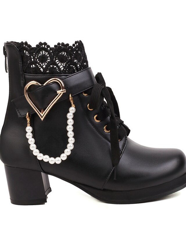 Vintage-Inspired Lace-Up Heart Pearl Chunky Heel Ankle Boots