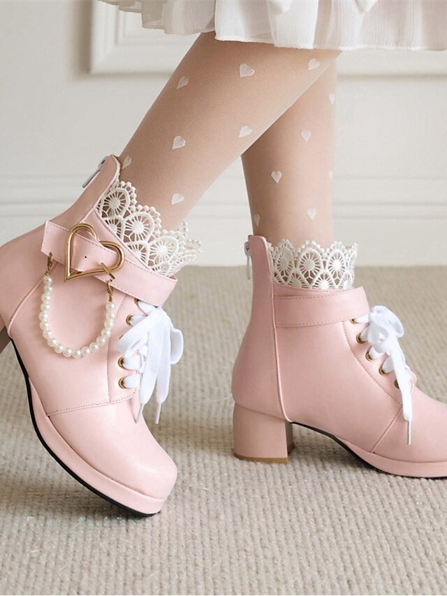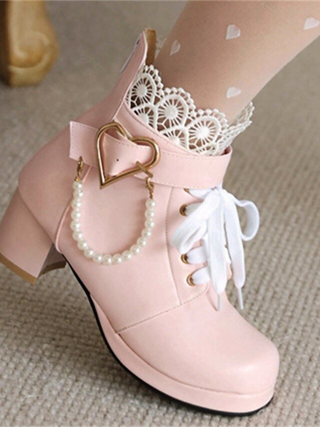 Be the first to review “Vintage-Inspired Lace-Up Heart Pearl Chunky Heel Ankle Boots”