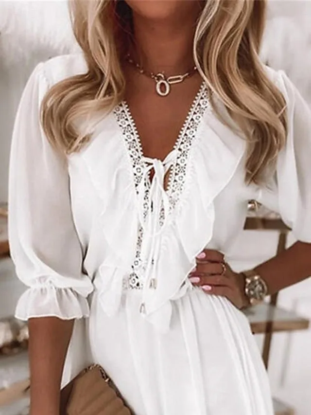 Dieses weiße Minikleid verbindet romantische Vintage-Details mit einer entspannten, modernen Silhouette. Die feine Spitzenoptik, der V-Ausschnitt und die verspielte Rüsche verleihen dem Look eine feminine Leichtigkeit für sonnige Tage und besondere Momente.
