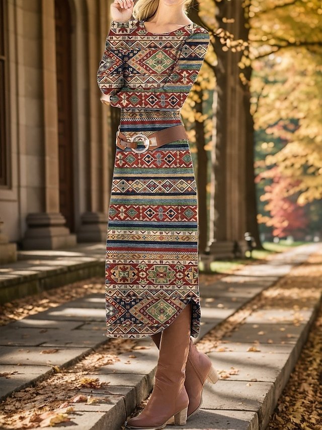 Embrace the elegance of winter’s embrace with our Vintage Loose Geometric Crew Neck Long Sleeve Midi Dress. This exquisite piece captures the timeless charm of tribal influences with a modern twist, making it an essential addition to your winter wardrobe. Whether you’re sipping mulled wine at an outdoor market or enjoying a casual day out, this dress promises to keep you both warm and stylish.
