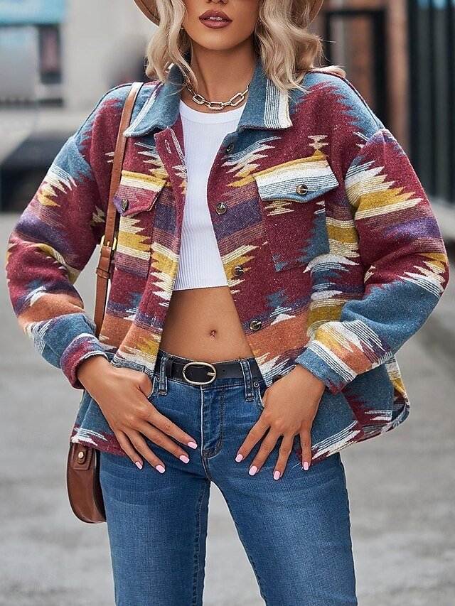 Discover elegance with our Vintage Geometric Long Sleeve Jacket in Wine Red. Perfect for summer, combining style and windproof function.